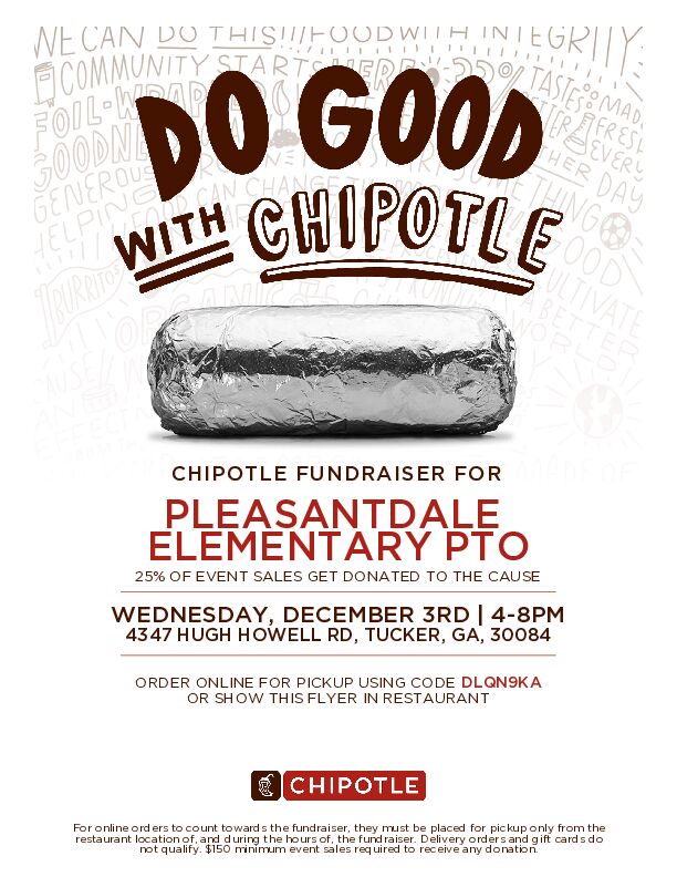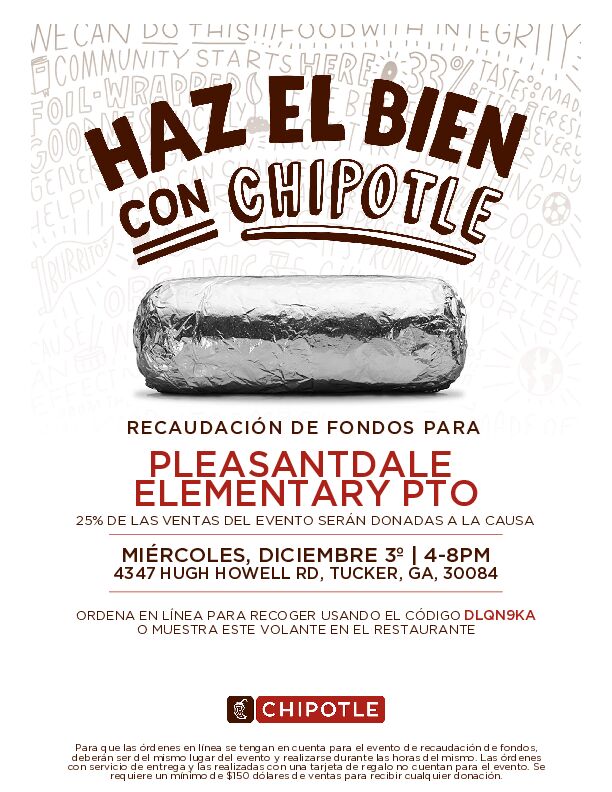 Pleasantdale Elementary PTO(Your Fundraiser) 12.03.2025 4:00pm - 8:00pm Guac on! Your fundraiser is now fully approved! Use this page to get the burrito rolling on your event by sharing your fundraiser on social media, downloading flyers in different formats, and checking out our fundraiser “dos and don’ts”. Best of luck with your fundraiser! |